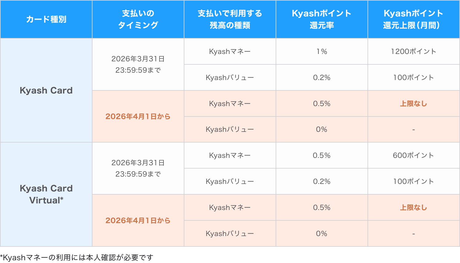 2026年4月1日から、Kyashマネー決済・Kyashバリュー決済のポイント付与の内容が変更になります。